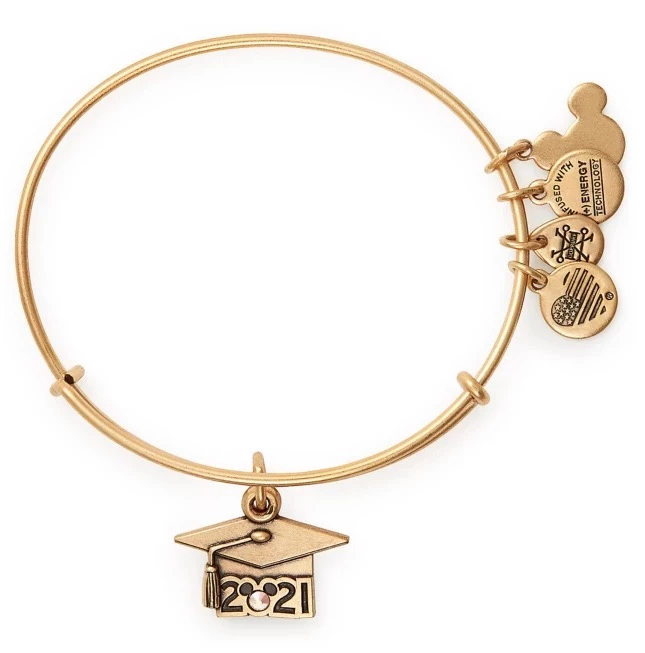 Celebrate your accomplishmentΒ with thisΒ 2021 Graduation Ear Hat bangle from Alex and Ani. The adjustable goldtone bracelet features a detailed mortar board charm with the ”2021” engraving incorporating a Mickey icon complete with Swarovski crystal to commemorate your sparkling scholastic success.