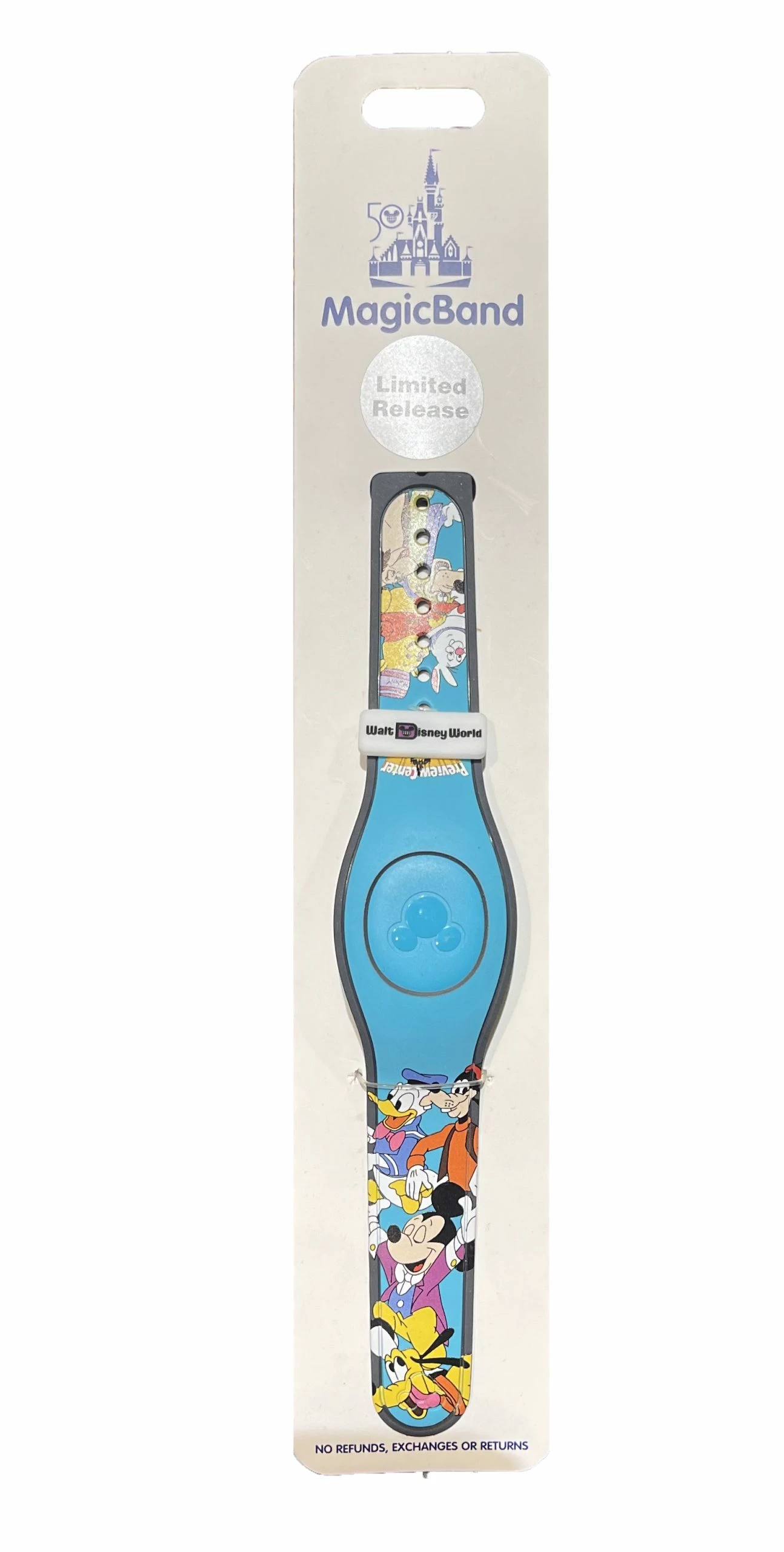 Celebrate the 50th Anniversary ofΒ Walt Disney WorldΒ Resort with Mickey and Friends on this blue MagicBand 2 depicting favorite retro souvenirs through the years. With a simple touch, redeem FastPass+, enter parks, charge purchases to your room, and more.