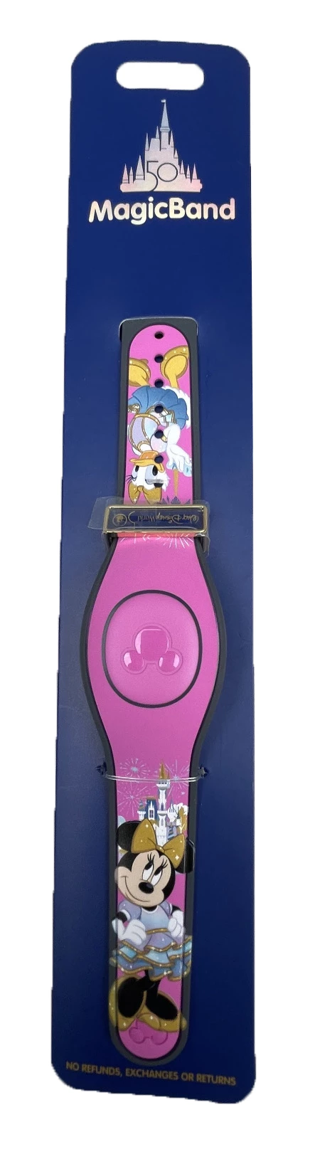 Celebrate Walt Disney World’s 50th Anniversary atΒ Walt Disney WorldΒ Resort wearing this MagicBand 2 design featuring Minnie & Daisy with castle and 50th clip. With a simple touch, redeem FastPass+, enter parks, charge purchases to your room, and more!